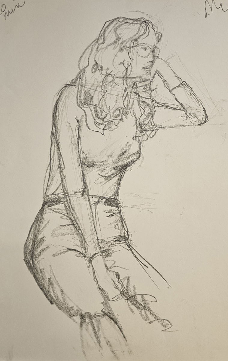 In life drawing sessions, artists typically work from a series of poses that vary in length, from quick gesture studies to longer poses that allow for more developed drawings. Each artist interprets the model in their own way, using different materials and approaches. The works in the slideshow below reflect that diversity – capturing moments of movement, rest, structure, and character through careful observation and personal expression.