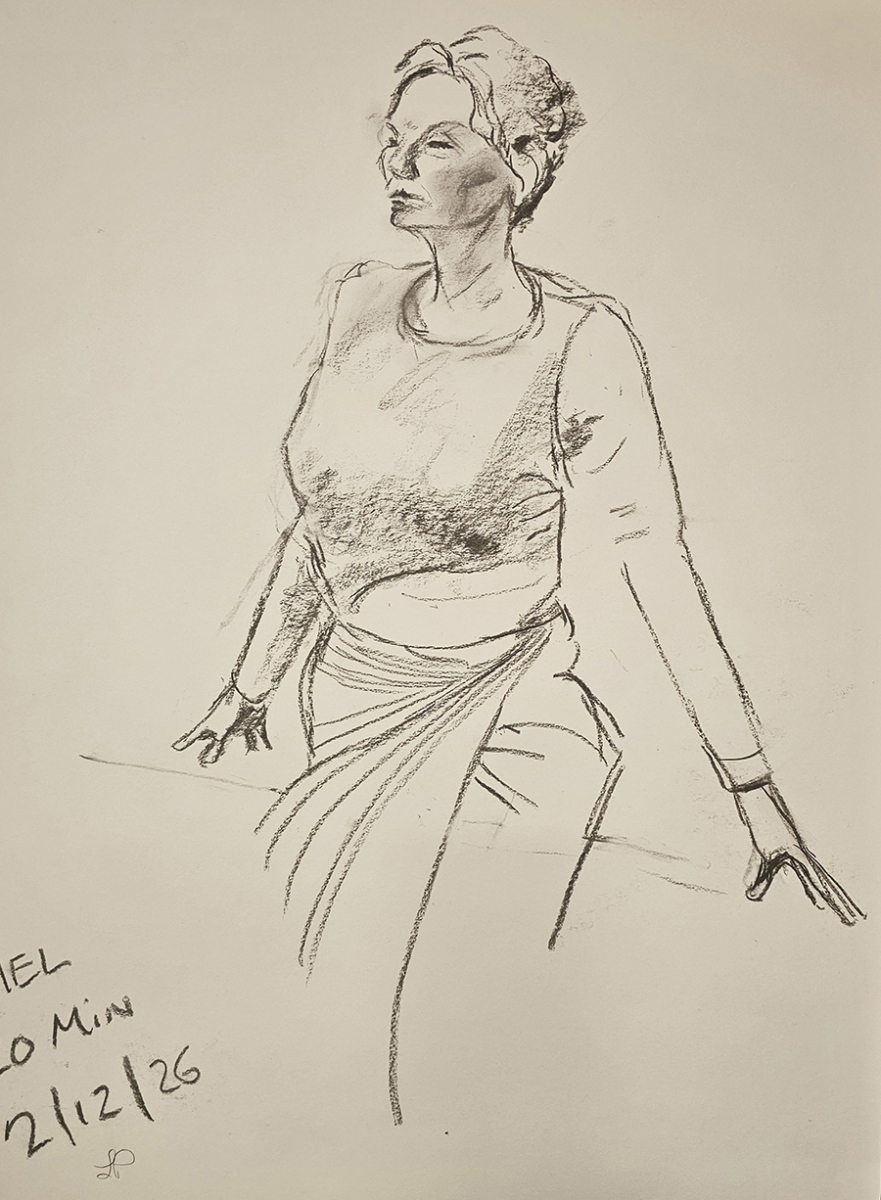 In life drawing sessions, artists typically work from a series of poses that vary in length, from quick gesture studies to longer poses that allow for more developed drawings. Each artist interprets the model in their own way, using different materials and approaches. The works in the slideshow below reflect that diversity – capturing moments of movement, rest, structure, and character through careful observation and personal expression.